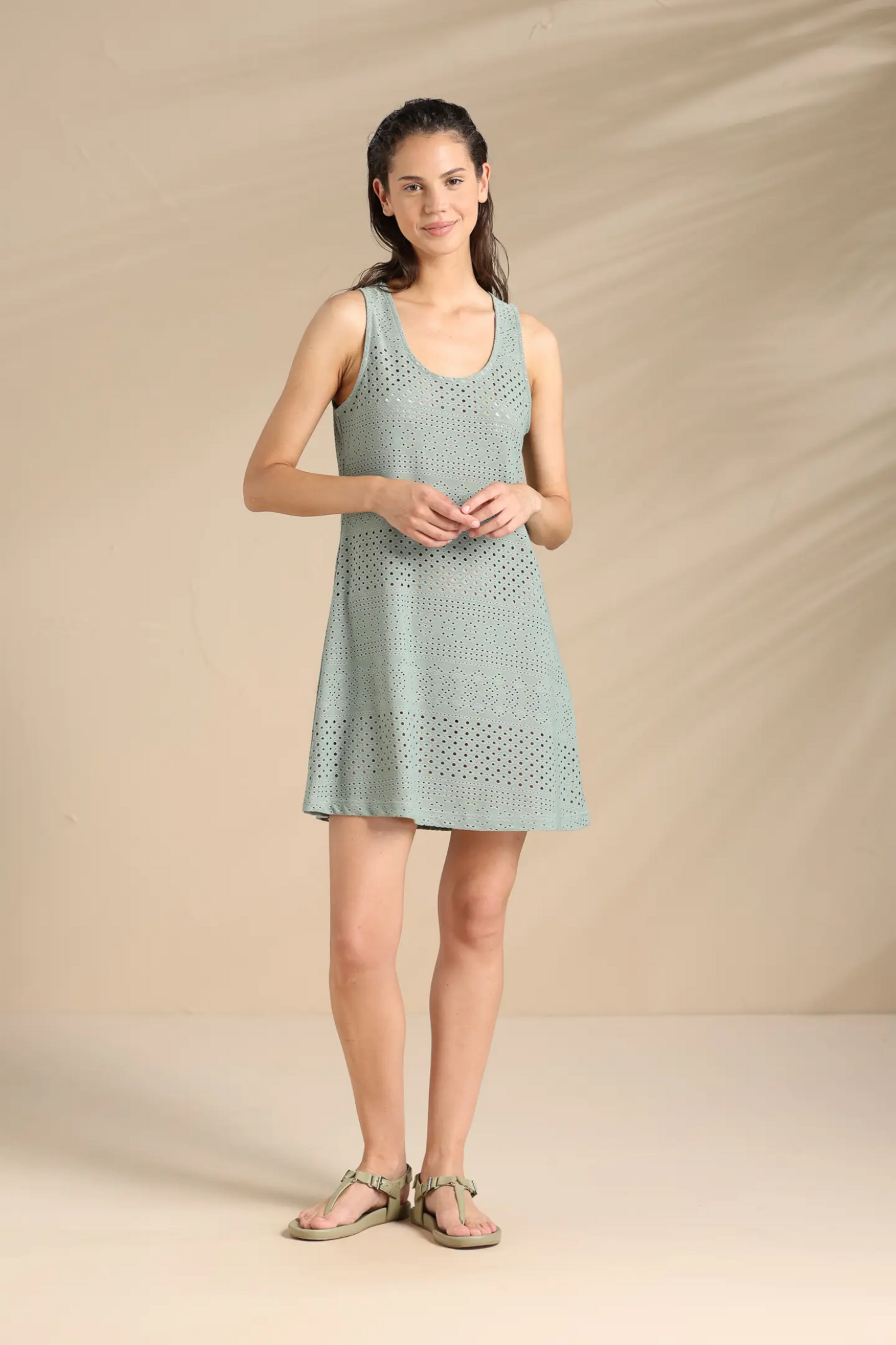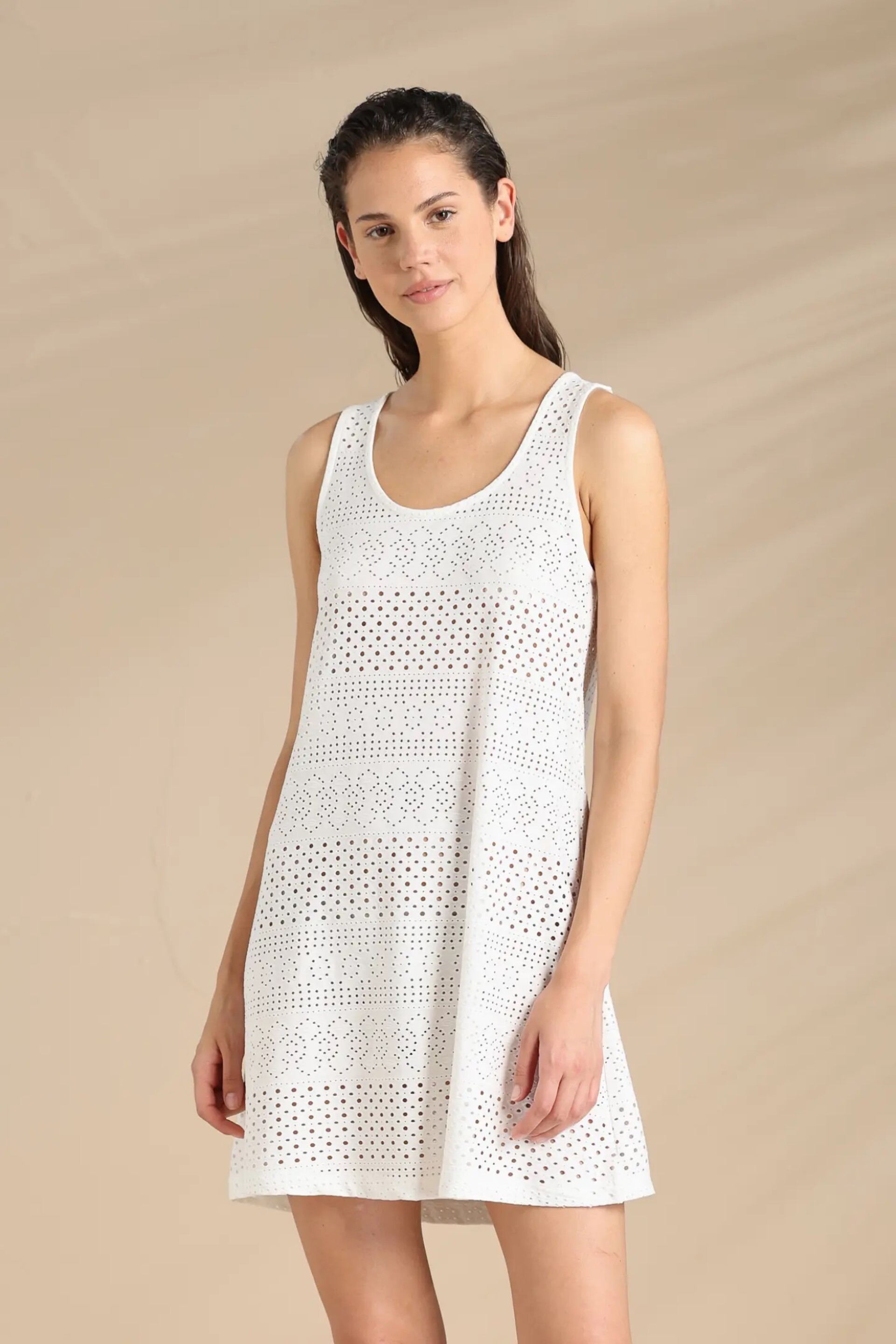 Abito donna estivo in poliestere ed elastane. Spalla larga con collo tondo, effetto sangallo.