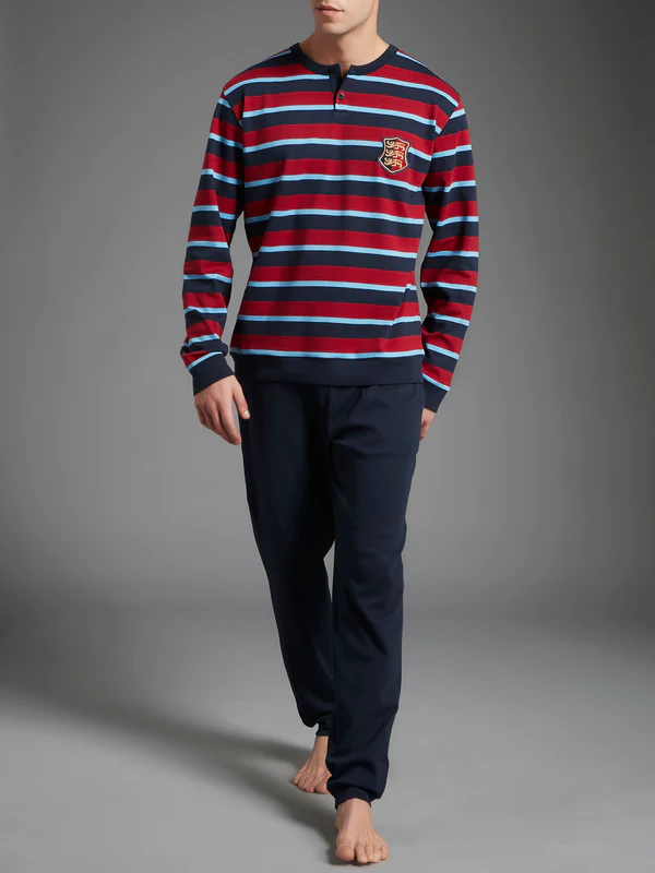 Composto da casacca a righe tinto in filo con collo a serafino, pantalone in tinta unita con polsino alla caviglia. Realizzato in interlock di puro cotone.
